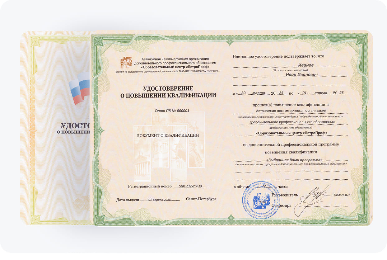 По завершении курса слушатели получают официальное удостоверение о повышении квалификации (УПК). Наш учебный центр обладает всеми необходимыми лицензиями и аккредитациями, подтверждающими качество услуг профобразования. Документ об образовании, выдаваемый по окончании программы, является официальной бумагой гос.образца, действительным на всей территории Российской Федерации.